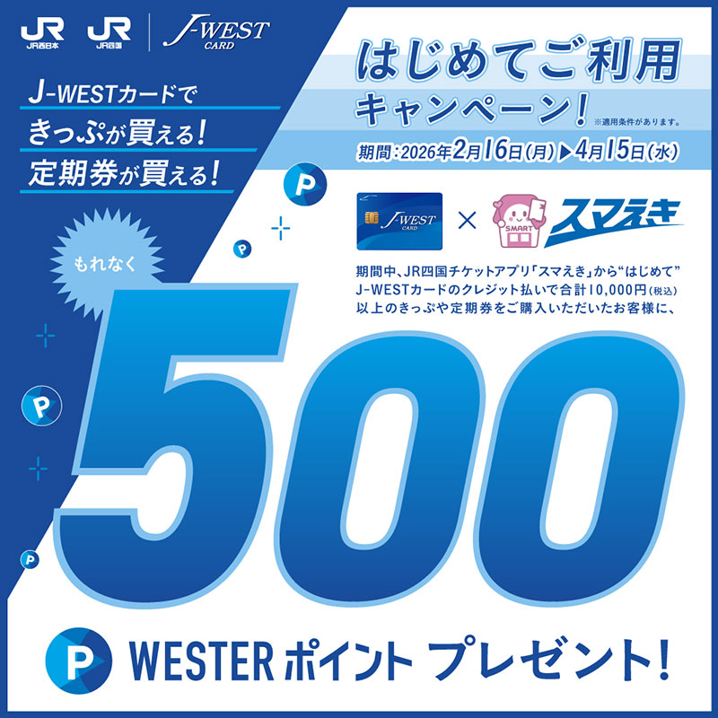 期間中、JR四国チケットアプリ「スマえき」から“はじめて”「J-WESTカード」のクレジット払いで合計10,000円(税込)以上のきっぷや定期券をご購入いただいたお客様に、WESTERポイントをもれなく500ポイントプレゼント!