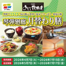 「ゆき券」「かえり券」のJR券と、琴弾廻廊でのお食事・ご入浴がセットになった日帰りの旅行に便利なき...