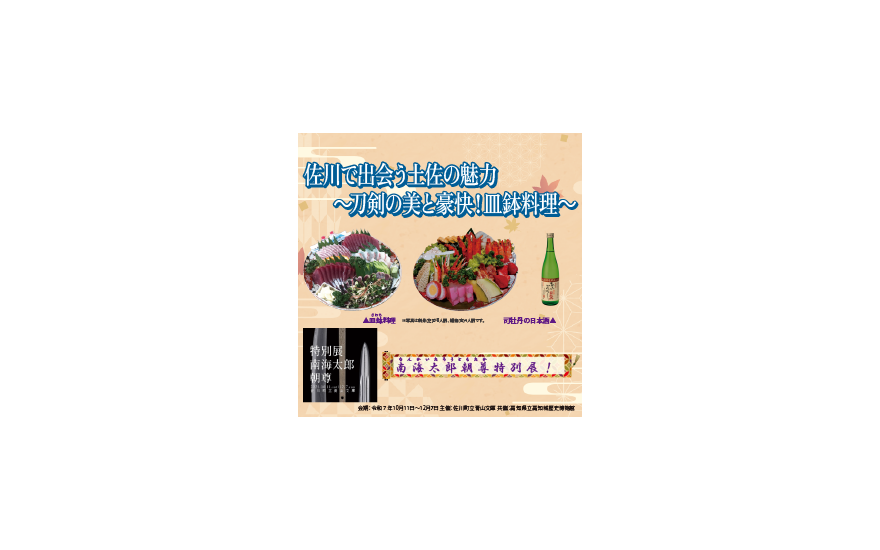 土佐人の心意気が生んだ皿鉢料理。高知県の海の幸をふんだんに使った刺身の皿鉢や「組み物」と呼ばれる山の幸を使った揚げ物・焼き物・果物と、自然の食材に恵まれた、高知ならではの食文化をお楽しみいただけます。また、見た目のインパクトが抜群!鯖を1匹丸ごと使った鯖寿司や、鰹のたたきが入った土佐巻きもご賞味ください。さらに今回のツアーでは司牡丹のお酒もご準備致しましたので高知のグルメと共にお楽しみください!
