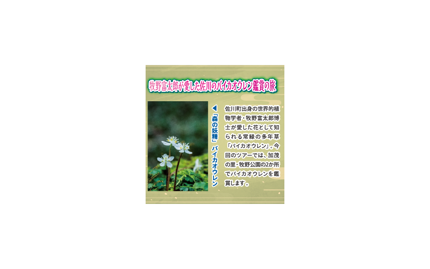 世界的植物学者・牧野富太郎が愛した花として知られる常緑の多年草「バイカオウレン」を加茂の里と牧野公園の2カ所で鑑賞します。